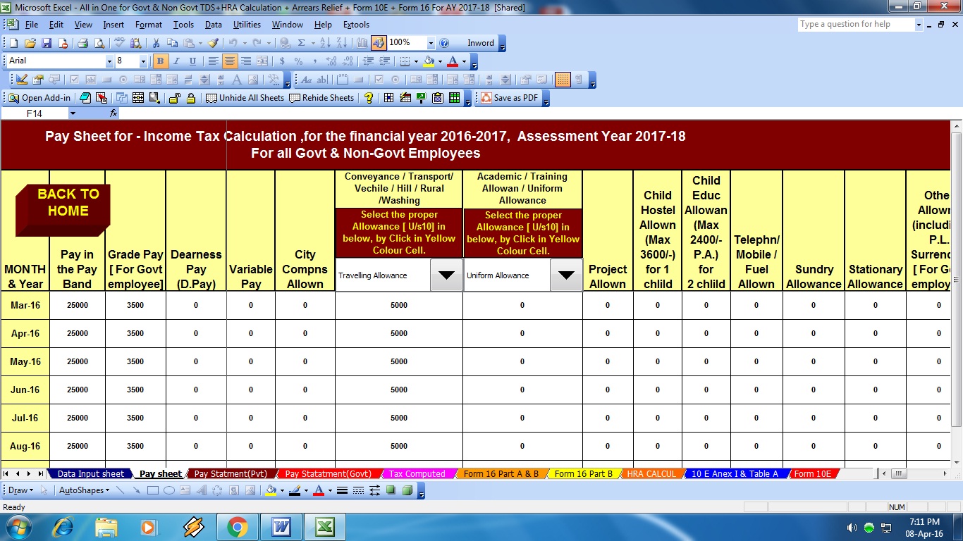Download All in One TDS on Salary for Govt & Non Govt employees for F.Y.2016-17 and A.Y.2017-18 [This Excel utility can prepare at a time Tax Computed Sheet + Individual Salary Sheet + Automatic Arrears Relief Calculator U/s 89(1) with Form 10E + Automatic H.R.A. Calculation U/s 10(13A) + Automated Form 16 Part A&B and Form 16 Part B for F.Y.2016-17 as per the Finance Budget 2016]